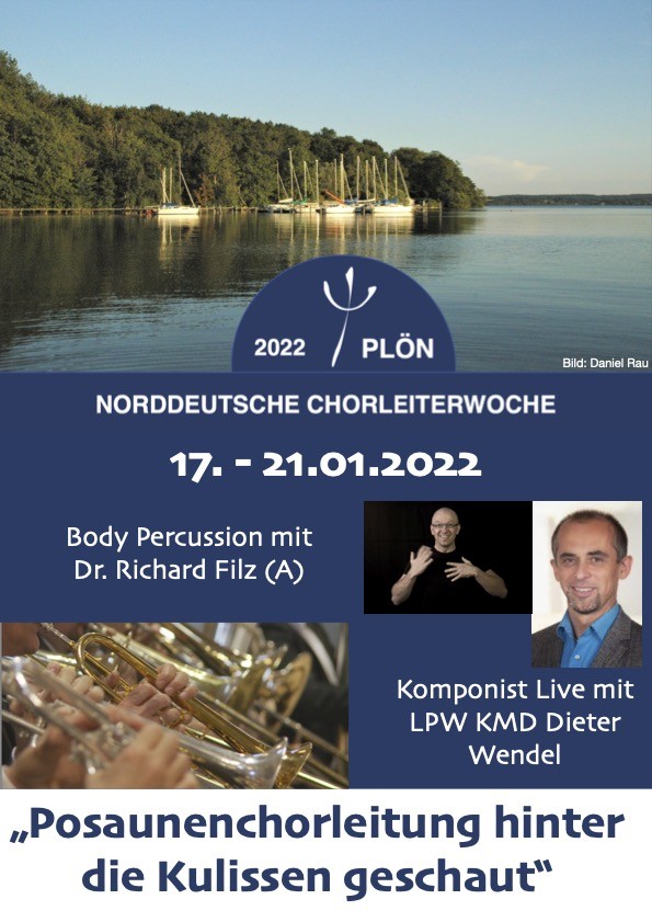 die nächste Norddeutsche Chorleiterwoche soll vom 17. bis 21. Januar 2022 auf dem Koppelsberg in Plön stattfinden. Neben vielen bekannten Landesposaunenwarten aus Norddeutschland sind diesmal auch Dr. Richard Filz (Bodypercussion, Rhythmik) und LPW KMD Dieter Wendel vom Verband evangelischer Posaunenchöre aus Bayern dabei.